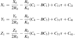 Y_1&=&\frac{Y_0}{2 R_0}-\frac{R_0}{K_0}(C_4-B C_3)+C_{31} \tau + C_{41} \nonumber\\[3pt]