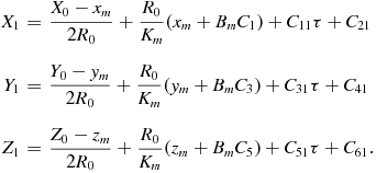 X_1&=&\frac{X_0}{2 R_0}-\frac{R_0}{K_0}(C_2-B C_1)+C_{11} \tau + C_{21} \nonumber\\[3pt]