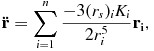where the sum is over all the massive bodies in the system, each with its own value for mass (rs ), square of the angular momentum of the light ray about the mass (K), and position of the particle relative to the mass (r).
