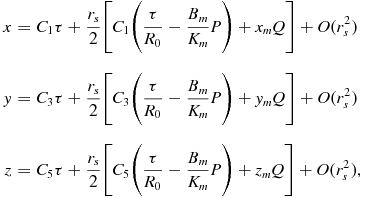 z&=&C_5\tau +\frac{r_s}{2}\bigg [C_5\bigg (\frac{\tau }{R_0}-\frac{B_m}{K_m}P\bigg )+z_m Q\bigg ]+O(r_s^2),