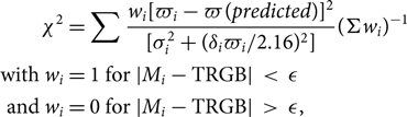 \begin{equation} \begin{array}{l} \quad \quad {\chi ^2} = \sum \frac{{{w_i}{{[{\varpi _i} - \varpi (predicted)]}^2}}}{{[\sigma _i^2 + {{({\delta _i}{\varpi _i}/2.16)}^2}]}}{(\Sigma {w_i})^{ - 1}} \\ with \ {w_i} = 1 \ {\rm{for}}|{M_i} - {\rm{TRGB}}| \lt \epsilon \\ \ and \ {w_i} = 0 \ {\rm{for}}|{M_i} - {\rm{TRGB}}| \gt \epsilon , \\ \end{array} \end{equation}