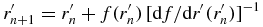 $r^{\prime }_{n+1}=r^{\prime }_n+f(r^{\prime }_n)\,[\text{d}f/\text{d}r^{\prime }(r^{\prime }_n)]^{-1}$. Note that r is a constant parameter in this context, as it is given by the known position of the particle in the uniform lattice.