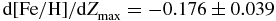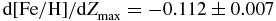 $\text{d}[\text{Fe}/\text{H}]/\text{d}Z_{{\rm max}}$, is − 0.176 ± 0.039 dex kpc−1 for Z max ⩽ 825 pc (upper panel) while it is − 0.119 ± 0.036 dex kpc−1 for Z max ⩽ 1500 pc (lower panel). The metallicity gradients,
