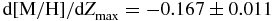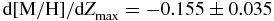 $\text{d}[\text{M}/\text{H}]/\text{d}Z_{{\rm max}}=-0.155\pm 0.035$ dex kpc−1 is also compatible with the corresponding values appearing in the literature which are estimated for stars with different vertical distances and Galactic latitudes, i.e.