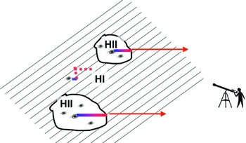 Figure 15. This Figure schematically shows why inhomogeneous reionisation boosts the visibility of Lyα emitting galaxies. During the mid and late stages of reionisation star-forming - and hence Lyα emitting - galaxies typically reside in large HII bubbles. Lyα photons emitted inside these HII bubbles can propagate - and redshift away from line resonance - through the ionised IGM before encountering the neutral IGM. The resulting reduced opacity of the neutral IGM (Equation (30)) to Lyα photons enhances the prospect for detecting Lyα emission from those galaxies inside HII bubbles.