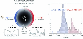 This equation shows that the opacity of the IGM drops dramatically once photons enter the first patch of neutral IGM with a redshift. This redshift may occur partly at the interstellar level, and partly at the intergalactic level: scattering off outflowing materialFootnote 25 at the interstellar level can efficiently redshift Lyα photons by a few hundred km/s (see Section 5.1). Because Lyα photons can undergo a larger cosmological subsequent redshift inside larger HII bubbles, Lyα emitting galaxies inside larger HII bubbles may be more easily detectedFootnote 26 . The presence of large HII bubbles during inhomogeneous reionisation may have drastic implications for the prospects of detecting Lyα emission from the epoch.