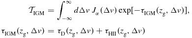 where J α(Δv) denotes the line profile of Lyα photons as they escape from the galaxy, and τD(z g, Δv) is the given by Equation (28). Equation (31) shows explicitly that there are two components to the IGM opacity: (i) τD(z g, Δv) describes the opacity in diffuse neutral intergalactic patches, and this component is thus unique to the reionisation epoch, and (ii) τHII(z g, Δv) the opacity of the ionised component of the IGM (which can be substantial, see Section 5.2).