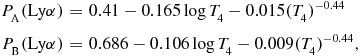 Figure 2 shows the total probability P(Lyα) (Equation (8)) that a Lyα photon is emitted per recombination event as a function of gas temperature T, assuming case-A recombination (solid line), and case-B recombination (dashed line). For gas at T = 104 K and case-B recombination, we have P(Lyα) = 0.68. This value ‘0.68′ is often encountered during discussions on Lyα emitting galaxies. It is worth keeping in mind that the probability P(Lyα) increases with decreasing gas temperature and can be as high as P(Lyα) = 0.77 for T = 103 K (also see Cantalupo, Porciani, & Lilly Reference Cantalupo, Porciani and Lilly2008). The red open circles represent the following two fitting formulae