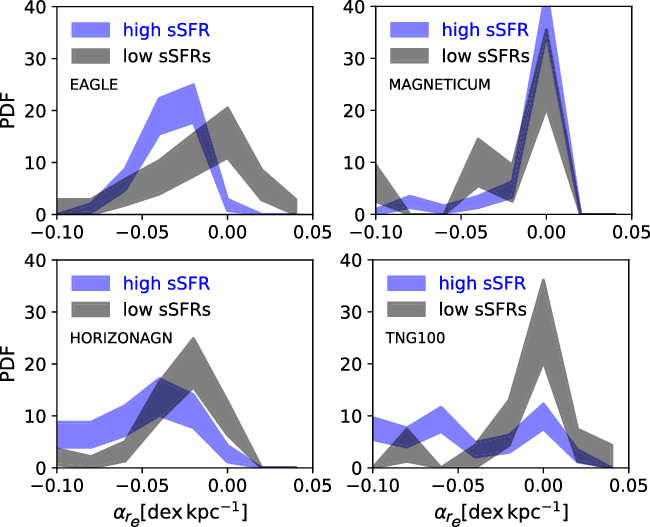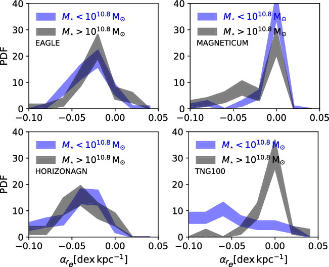Figure 9. Probability density function of the slope of the radial ionised gas metallicity profile for galaxies at $z\approx 0.3$ for the ‘well-resolved’ MAGPI-like samples of the cosmological hydrodynamical simulations EAGLE, Magneticum, HORIZON-AGN, and Illustris-TNG100, as labelled in each panel. Here, the slope of the radial metallicity profile was measured at $r, with $r_{e}$ being the half-light radius in the r-band. We show separately the expected distribution in high- and low-density environments, defined in the same way as in Figure 1. The range of each histogram represents the Poisson error.