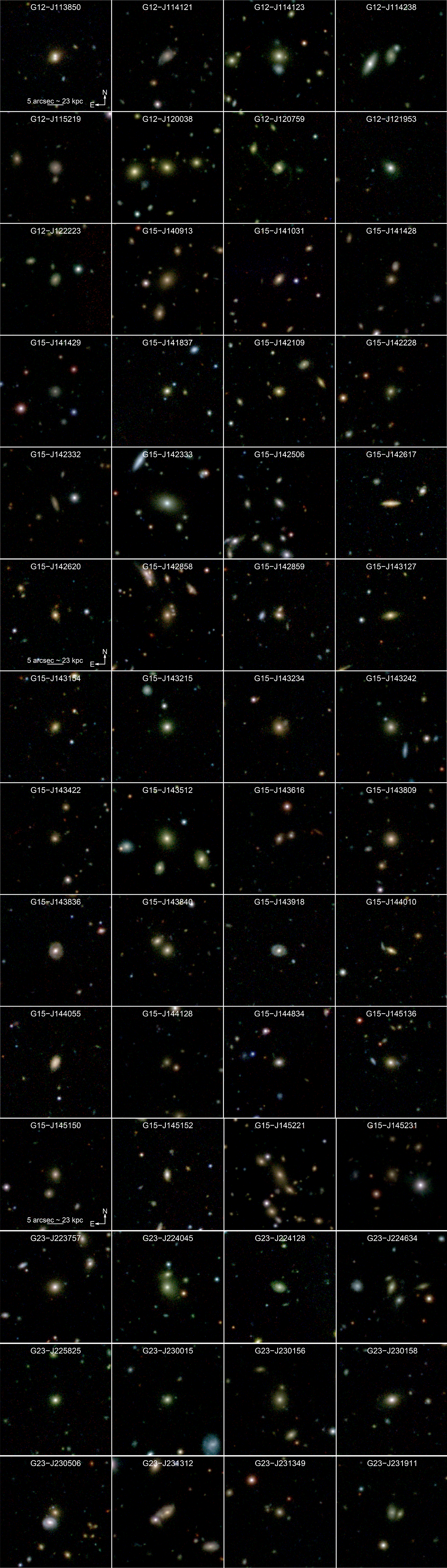 Figure B.1 : Colour (${\rm R}=Z$, ${\rm G}=r$, ${\rm B}=g_{\rm mod}$) KiDS images for all MAGPI fields, as labelled. In all panels, and as labelled in the top left panel, North is up and East is to the left. A scale of 5 arcsec (corresponding to ${\sim}23$ kpc at $z\sim0.3$) is shown on the top left panel for reference. All square images are 1 arcmin to the side.