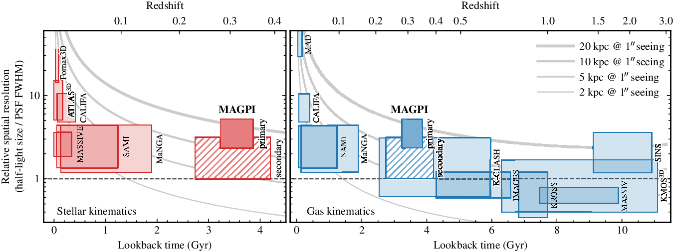 Figure 2. Comparison of the MAGPI spatial resolution with that of other dedicated IFS surveys focused on stellar (left panel) and gas (right panel) kinematics. Shaded regions indicate the typical space occupied by surveys in terms of lookback time and spatial resolution, defined here as the ratio of galaxy half-light size relative to the PSF FWHM. We compare data from the MAGPI primary and secondary samples (see Section 3.1) to that of other IFS surveys, including SAMI (Croom et al. Reference Croom2012), MaNGA (Bundy et al. Reference Bundy2015), MASSIVE (Ma et al. Reference Ma, Greene, McConnell, Janish, Blakeslee, Thomas and Murphy2014), CALIFA (Sánchez et al. Reference Sánchez2012), Fornax3D (Sarzi et al. Reference Sarzi2018),