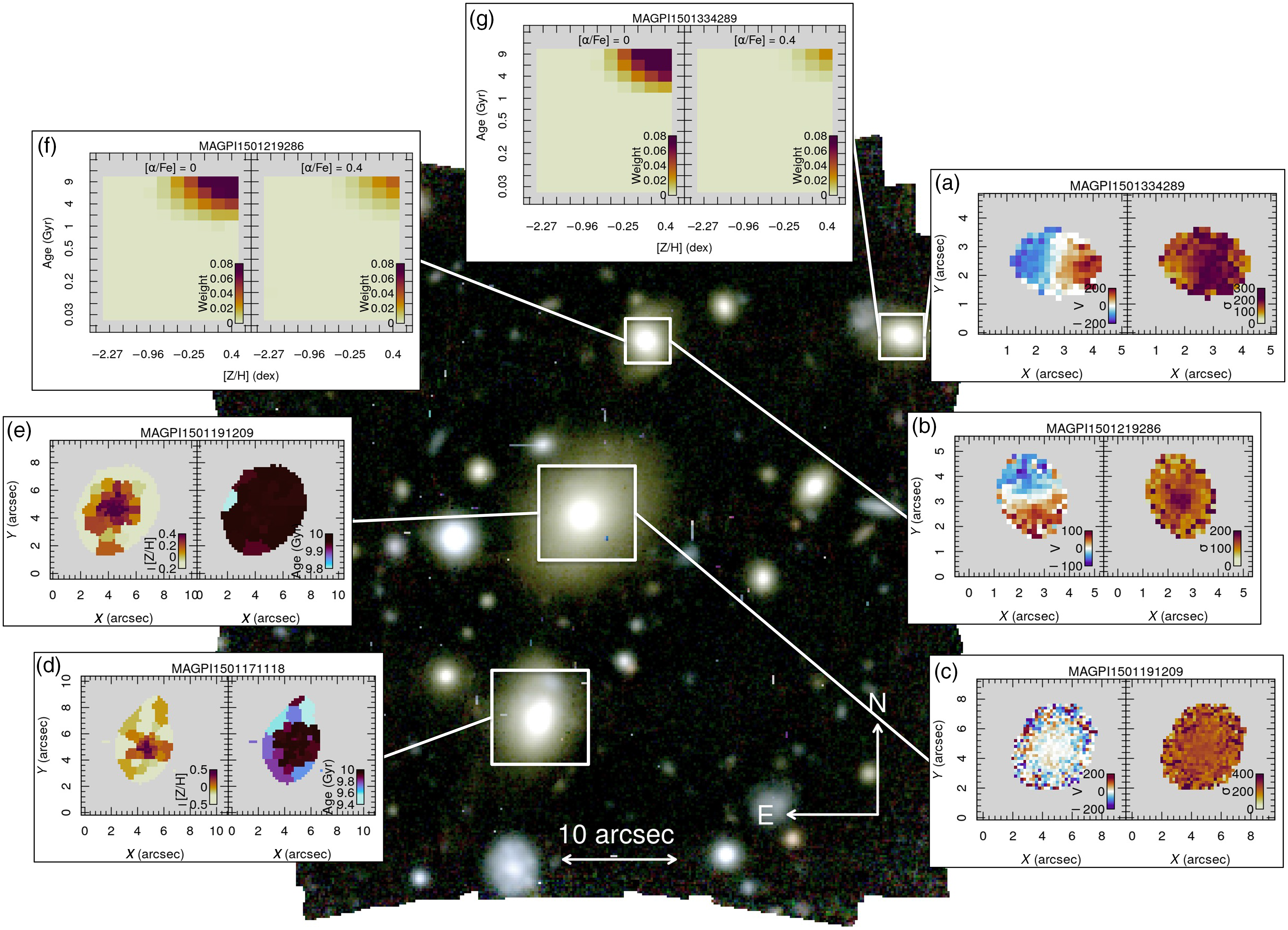 Figure 4. Synthetic colour image (${\rm R}=i$, ${\rm G}=r$, ${\rm B}=g_{\rm mod}$) of the MAGPI field G15-J140913. Insets show a variety of high level data products as labelled. Stellar velocity (V) and velocity dispersion ($\sigma$) maps are shown for MAGPI1501334289 (Panel A), MAGPI1501219286 (Panel B), and MAGPI15011501191209 (Panel C). Stellar age and metallicity maps are derived for MAGPI1501171118 (Panel D) and MAGPI1501191209 (Panel E), while stellar populations in a 1 arcsec aperture are shown for MAGPI1501219286 (Panel F) and MAGPI1501334289 (Panel G). This figure highlights the exceptional depth and richness of the MAGPI data: our average targets are comparable to the best targets in local IFS surveys.