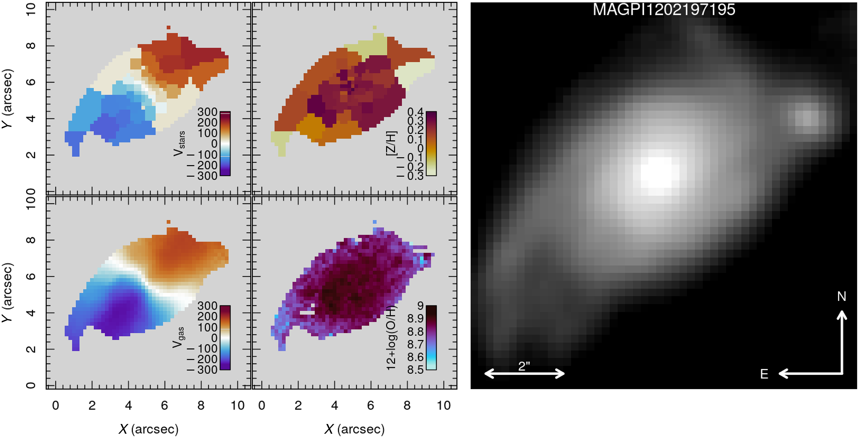 Figure 7. Example primary MAGPI galaxy with significant ionised gas component allowing for direct comparison of stellar and gas properties at $z{\sim}0.3$. Right: Synthetic white-light image of MAGPI1202197195, the central galaxy for field G12-J114121. A 2 arcsec scale (${\sim}8.9$ kpc) is shown for reference. Left panels show the star (top) and gas (bottom) kinematic maps, while middle panels show stellar (top) and gas-phase (bottom) metallicities. North is up and East is left.