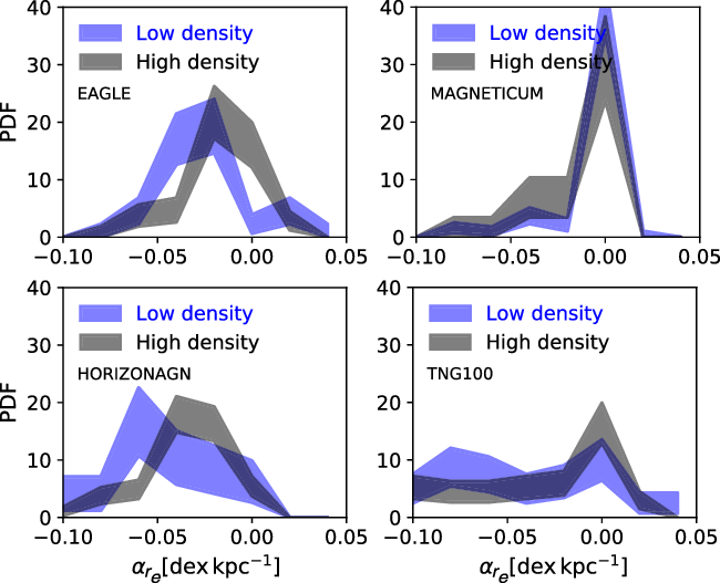 for the four simulations and in two density environments, which are defined in the same way as above and Figure 1. Interestingly, the simulations differ significantly in their predictions, with Illustris-TNG100 predicting a much wider distribution of