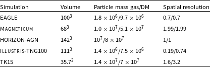 Magneticum.Footnote f Metals and energy are released by stars of different mass by integrating the evolution of the stellar population (see Dolag, Mevius, & Remus Reference Dolag, Mevius and Remus2017, for details) (in a similar fashion to the other simulations summarised here). The interstellar medium is treated as a two-phase medium where clouds of cold gas form from cooling of hot gas and are embedded in the hot gas phase assuming pressure equilibrium whenever gas particles are above a given threshold density,