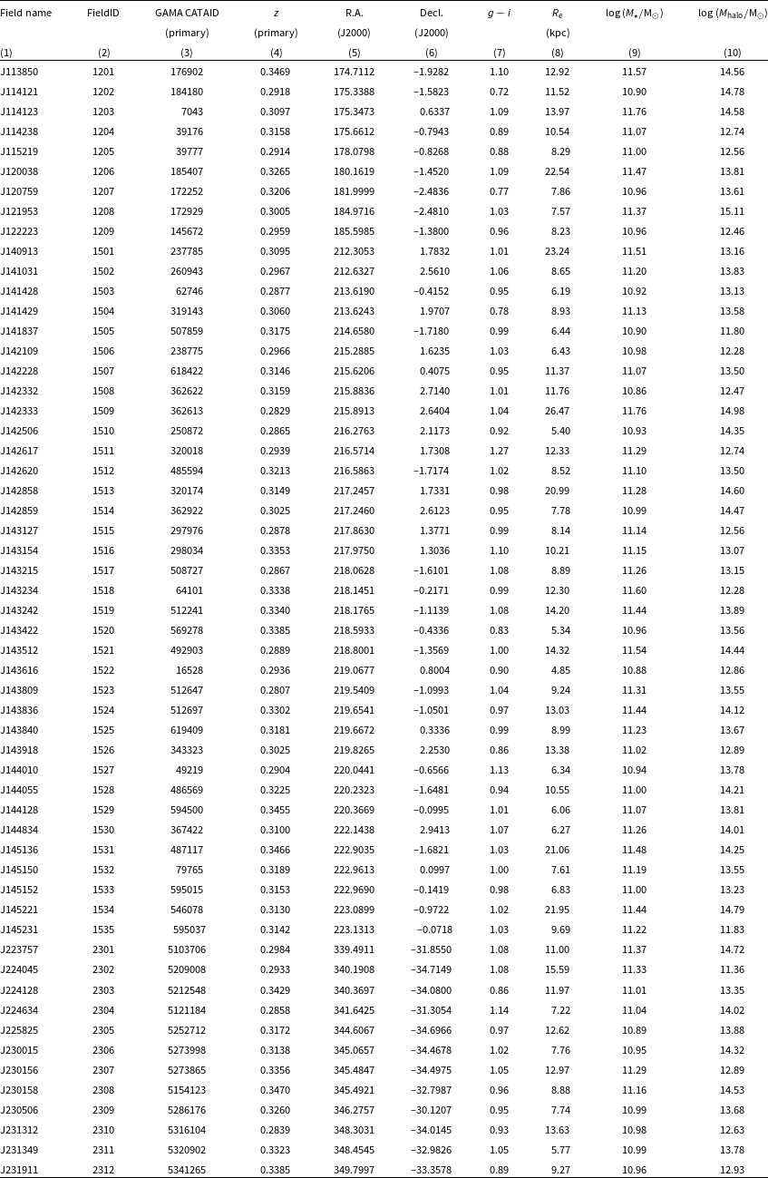 colour from KiDS. Column(8): half-light size derived following Kelvin et al. (Reference Kelvin2012). Column(9): galaxy stellar mass from Taylor et al. (Reference Taylor2011). Column (10): dark matter halo mass, taken from the G3C catalogues described in Robotham et al. (Reference Robotham2011).