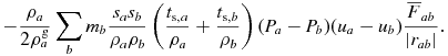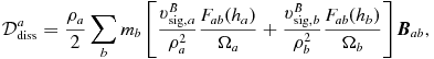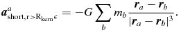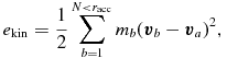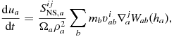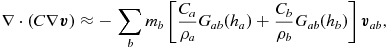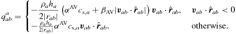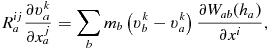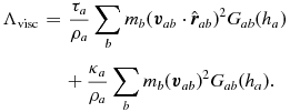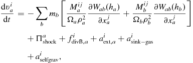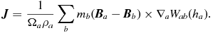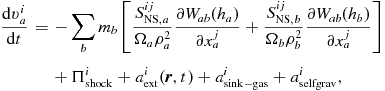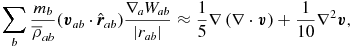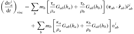 where a and b are particle labels, m is the mass of the particle, W is the smoothing kernel, h is the smoothing length, and the sum is over neighbouring particles (i.e. those within R kernh, where R kern is the dimensionless cut-off radius of the smoothing kernel). Taking the Lagrangian time derivative of (3), one obtains the discrete form of (2) in SPH