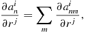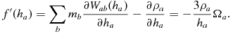 f^{\prime }(h_{a}) = \sum _{b} m_{b} \frac{\partial W_{ab} (h_{a})}{\partial h_{a}} - \frac{\partial \rho _{a}}{\partial h_{a}} = -\frac{3\rho _{a}}{h_{a}} \Omega _{a}.