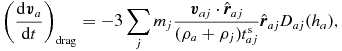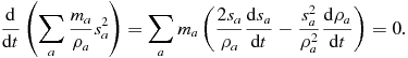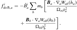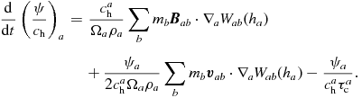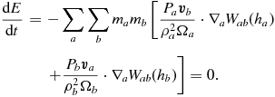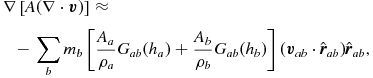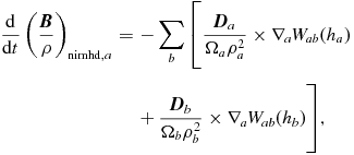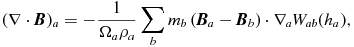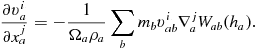 \frac{{\rm d}\rho _{a}}{{\rm d}t} = \frac{1}{\Omega _{a}} \sum _{b} m_{b} ({\bm v}_{a} - {\bm v}_{b}) \cdot \nabla _{a} W_{ab} (h_{a}),