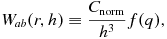 W_{ab}(r,h) \equiv \frac{C_{\rm norm}}{h^{3}} f(q),
