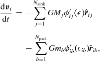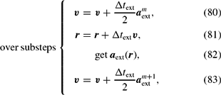 Figure A8. Pseudo-code for the timestepping routine, showing how the interaction between individual timestepping and the RESPA algorithm is implemented. External forces and sink–gas interactions are computed on the fastest timescale Δt short ≡ Δt ext. Additional quantities defined on the particles follow the velocity terms. The variable t was stores the last time the particle was active and is used to interpolate and synchronise the velocities at the beginning and end of each timestep.