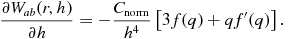 \frac{\partial W_{ab}(r,h)}{\partial h} = - \frac{C_{\rm norm}}{h^{4}} \left[ 3 f(q) + qf^{\prime }(q) \right].