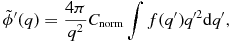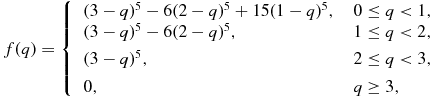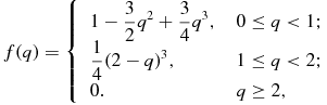f(q) = \left\lbrace \arraycolsep5pt\begin{array}{ll}1 - \displaystyle\frac{3}{2} q^{2} + \displaystyle\frac{3}{4} q^{3}, & 0 \le q < 1; \\[3pt]