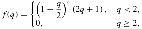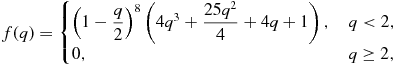 f(q) = \left\lbrace \arraycolsep5pt\begin{array}{@{}ll@{}}\left(1 - \displaystyle\frac{q}{2} \right)^{4} \left(2 q + 1\right), & q < 2, \\[3pt]
