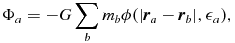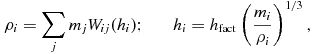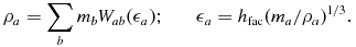 \rho _{a} = \sum _{b} m_{b} W(\vert {\bm r}_{a} - {\bm r}_{b}\vert , h_{a}),