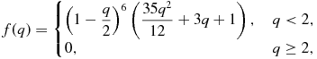 f(q) = \left\lbrace \arraycolsep5pt\begin{array}{@{}ll@{}}\left(1 - \displaystyle\frac{q}{2}\right)^{6} \left(\displaystyle\frac{35 q^{2}}{12} + 3 q + 1\right), & q < 2, \\[3pt]