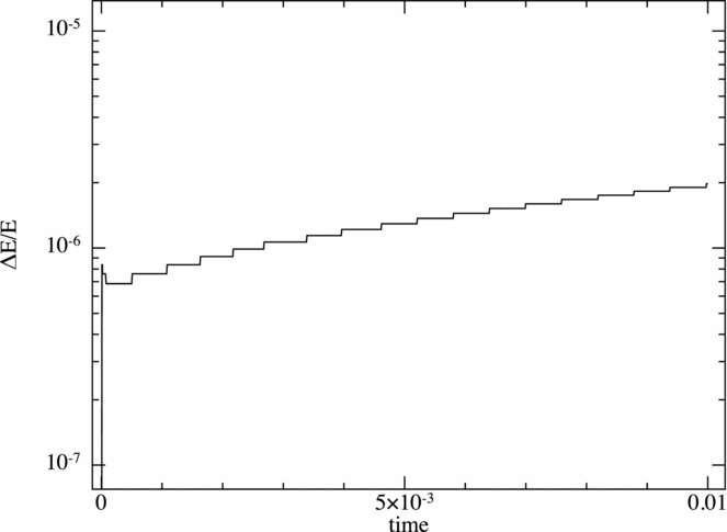 As a final ‘real’ unit test, the code performs a low-resolution (163) version of the Sedov blast wave test (Section 5.1.3). We check that energy and momentum are conserved at a precision appropriate to the timestepping algorithm (for global timesteps, this means momentum conservation to machine precision and energy conservation to ΔE/E 0 < 5 × 10−4; for individual timesteps, we ensure linear momentum conservation to 2 × 10−4 and energy conservation to 2 × 10−2).