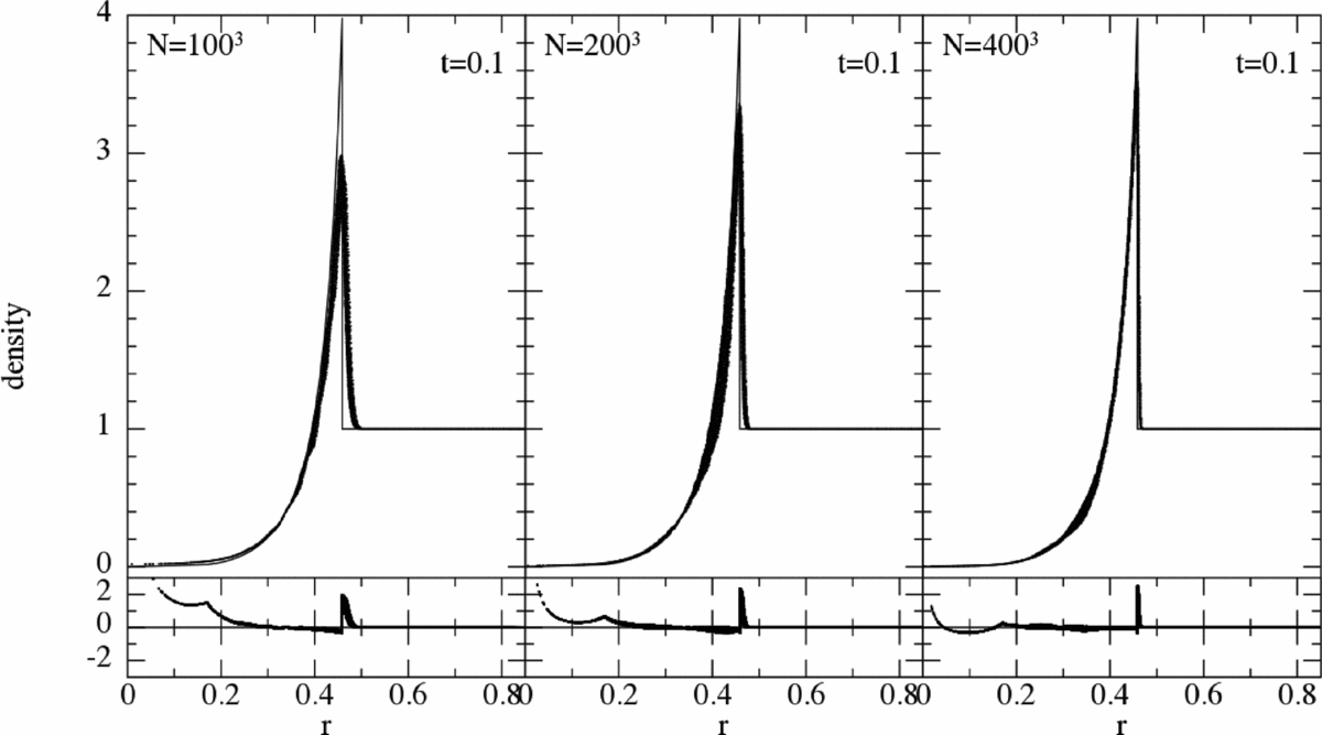 $\mathcal {O}(N^{2})$ computational cost. Convergence in SPH is guaranteed to be second order (∝h 2) to the degree that the finite summations over neighbouring particles approximate integrals (e.g. Monaghan Reference Monaghan1992, Reference Monaghan2005; Price Reference Price2012a). Hence, the choice of kernel and the effect that a given kernel has on the particle distribution are important considerations.