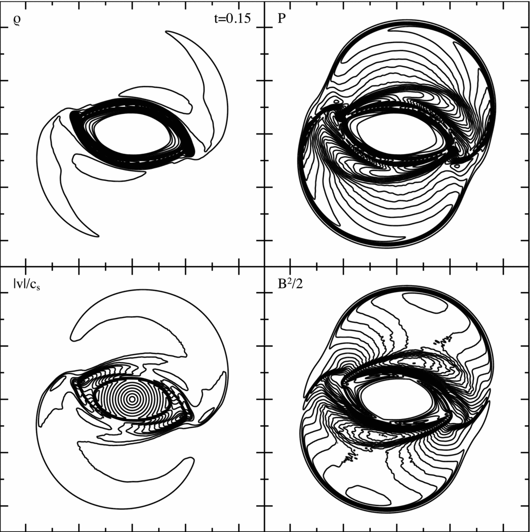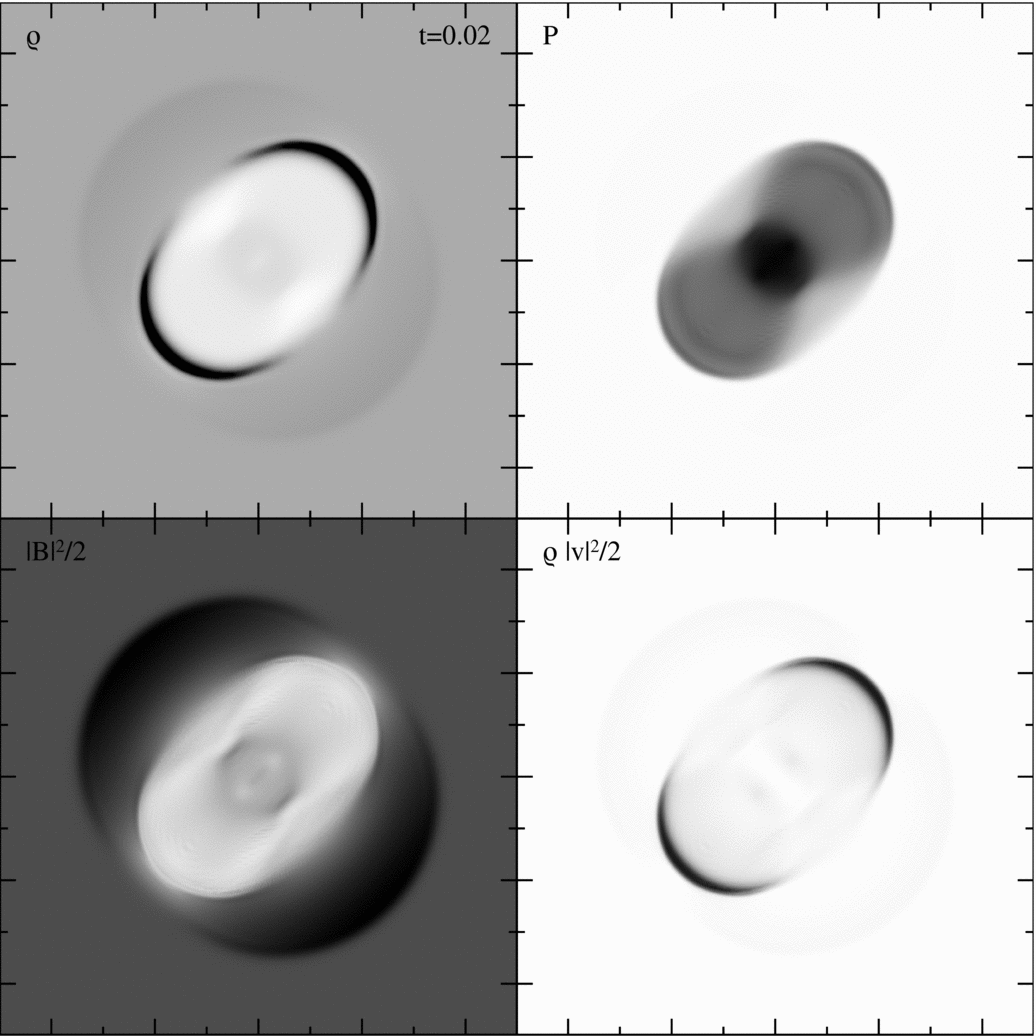 This procedure is repeated for the various derivatives of velocity, including the velocity divergence, curl, and all components of the strain tensor. We also test the artificial viscosity terms this way—checking that they translate correctly according to (119)—as well as the magnetic field derivatives and time derivatives, magnetic forces, artificial resistivity terms, physical viscosity terms, time derivatives of the dust fraction, and the time derivative of the velocity divergence required in the viscosity switch. We perform each of these tests also for the case where derivatives are evaluated on only a subset of the particles, as occurs when individual particle timesteps are employed.
