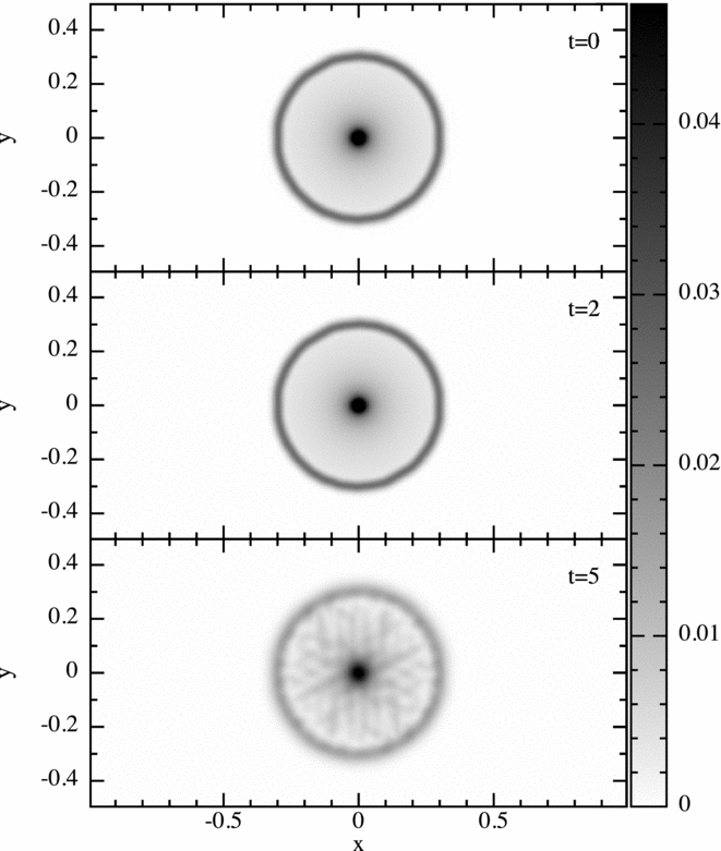 Several authors have argued for use of the Wendland kernels by default. For example, Rosswog (Reference Rosswog2015) found best results on simple test problems using the C 6 Wendland kernel. However, ‘best’ in that case implied using an average of 356 neighbours in 3D (i.e. h fact = 2.2 with R kern = 2.0) which is a factor of 6 more expensive than the standard approach. Similarly, Hu et al. (Reference Hu, Naab, Walch, Moster and Oser2014) recommend the C 4 kernel with 200 neighbours which is 3.5 times more expensive. The large number of neighbours are needed because the Wendland kernels are always worse than the B-splines for a given number of neighbours due to the positive Fourier transform, meaning that the kernel bias (related to the Fourier transform) is always positive where the B-spline errors oscillate around zero (Dehnen & Aly Reference Dehnen and Aly2012). Hence, whether or not this additional cost is worthwhile depends on the application. A more comprehensive analysis would be valuable here, as the ‘best’ choice of kernel remains an open question (see also the kernels proposed by Cabezón, García-Senz, & Relaño Reference Cabezón, García-Senz and Relaño2008; García-Senz et al. Reference García-Senz, Cabezón, Escartín and Ebinger2014). An even broader question regards the kernel used for dissipation terms, for gravitational force softening and for drag in two-fluid applications (discussed further in Section 2.13). For example, Laibe & Price (Reference Laibe and Price2012a) found that double-hump-shaped kernels led to more than an order of magnitude improvement in accuracy when used for drag terms.