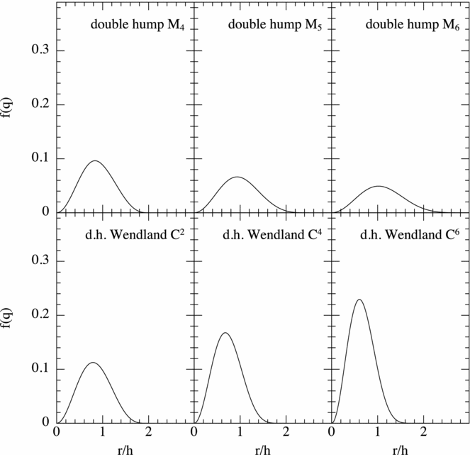 Recently, there has been tremendous interest in the use of the Wendland (Reference Wendland1995) kernels, particularly since Dehnen & Aly (Reference Dehnen and Aly2012) showed that they are stable to the pairing instability at all neighbour numbers despite having a Gaussian-like shape and compact support. These functions are constructed as the unique polynomial functions with compact support but with a positive Fourier transform, which turns out to be a necessary condition for stability against the pairing instability (Dehnen & Aly Reference Dehnen and Aly2012). The 3D Wendland kernels scaled to a radius of 2h are given by C 2: