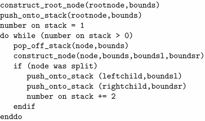 Figure A2. Pseudo-code for the tree build. The construct_node procedure computes, for a given node, the centre of mass, size, maximum smoothing length, quadrupole moments, and the child and parent pointers and the boundaries of the child nodes.
