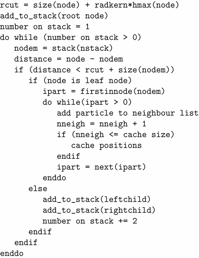 where r 2nm ≡ (xn − xm)2 + (yn − ym)2 + (zn − zm)2 is the square of the separation between the node centres and s is the node size. Any node m satisfying this criteria, that is not a leaf node, has its children added to the stack and the search continues. If node m is a leaf node, then the list of particles it contains are added to the trial neighbour list and the positions cached. The end product is a list of trial neighbours (listneigh), its length nneigh, and a cache containing the trial neighbour positions (xyzcache) up to some maximum size (12 000 by default, the exact size not being important except that it is negligible compared to the number of particles). Trial neighbours exceeding this number are retrieved directly from memory during the density calculation rather than from the cache. This occurs rarely, but the overflow mechanism allows for the possibility of a few particles with a large number of neighbours, as happens under certain circumstances.