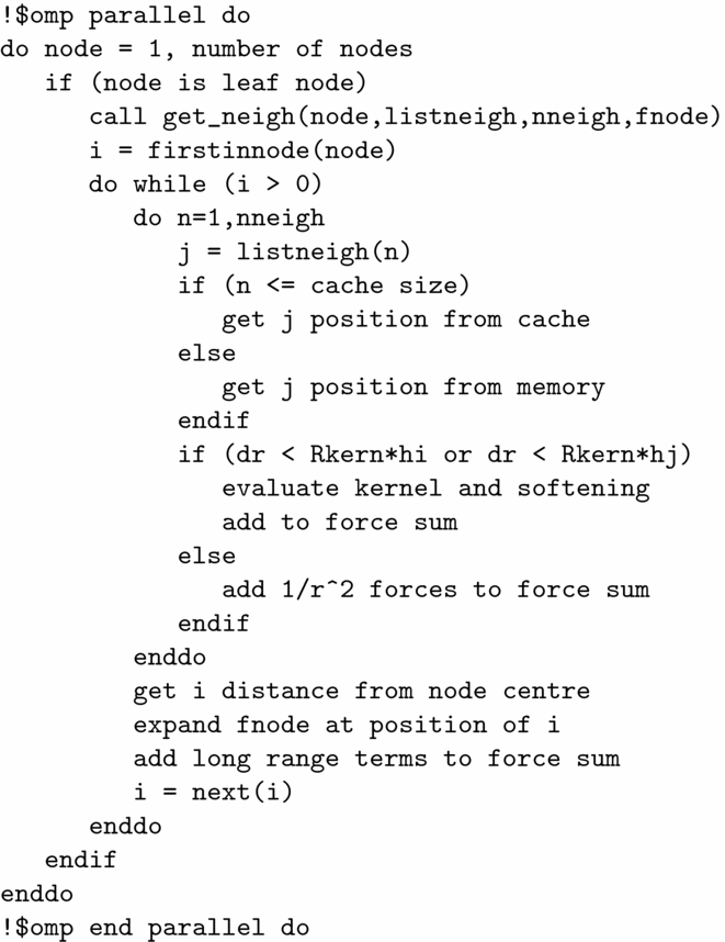 Shared memory parallelisation of the density and force calculation is described in pseudo-code in Figure A4. The parallelisation is done over the ‘leaf nodes’, each containing around 10 particles. Since the leaf nodes can be done in any order, this can be parallelised with a simple $omp parallel do statement. The neighbour search is performed once for each leaf node, so each thread must store a private cache of the neighbour list. This is not an onerous requirement, but care is required to ensure that sufficient per-thread memory is available. This usually requires setting the OMP_STACKSIZE environment variable at runtime. No thread locking is required during the density or force evaluations (unless the single loop algorithm is employed; see Section A.3.4) and the threads can be scheduled at runtime to give the best performance using either dynamic, guided or static scheduling (the default is dynamic). Static scheduling is faster when there are few density contrasts and the work per node is similar, e.g. for subsonic turbulence in a periodic box (c.f. Price Reference Price2012b).