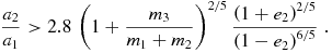 a_2 & < 0.53 \, {\rm AU} \, \left( \frac{a_1}{0.01 \, {\rm AU}} \right)^{4/3} \left( \frac{m_1+m_2}{5 \, {\rm M}_{\odot }} \right)^{-1/3} \nonumber \\