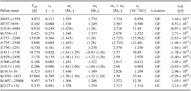 Table 1. Properties of the observed NSNS systems (adapted from Tauris et al. Reference Tauris2017). Pulsar name indicates the name of the radio pulsar(s) in the system. Quantities in brackets are assumed. In particular, if m 2 is not measured, but m 1 + m 2 is, m 2 = 1.28 M⊙ is assumed (central value of the measured secondary mass distribution; for B1930−1852, m 2 = 1.29M⊙ to be compatible with observational limits). If also m 1 + m 2 is not measured, m 1 + m 2 = 2.725 M⊙ is assumed (central value of the measured total mass distribution). The semi-major axis a 1 is computed assuming a Keplerian orbit. In the location column, GF and GC stand for galactic field and globular cluster, respectively.