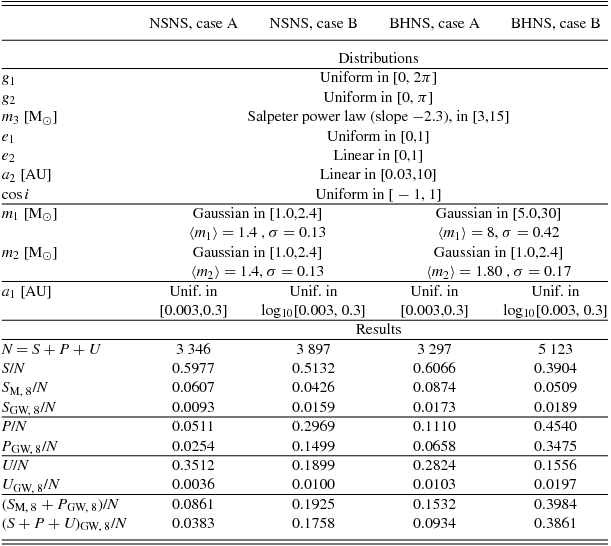 Table 2. Top: Summary of the distributions applied to produce the population of triple systems discussed in Section 5. Bottom: Summary of the results obtained from the above populations. S, P, and U represent the number of stable non-processing, precessing, and unstable triple system in each population, respectively. X GW, 8 is the number of system of type X whose inner binary has a GW-coalescence time-scale shorter than 108 yr without considering the third body perturbation, whereas S M, 8 is the number of triple stable, non-precessing systems whose merger time-scale is shorter than 108 yr. The comparison between the last two rows shows the boosting effect of triple interactions.
