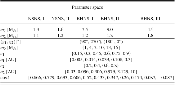 In this appendix, we report on a broader parameter space exploration of hierarchical, non-precessing triple systems with few selected masses for the inner compact binary. The main goal of this study is to highlight which parameters are most relevant in shaping the KL efficiency, eventually causing binary coalescence. In Table 3, we summarise the surveyed parameter space and its sampling. For the NSNS (BHNS) case, we choose two (three) different mass combinations, and for each of them two further choices of the initial inner and outer arguments of pericentre (i.e. g 1, g 2). For m 3, we choose six values in the range [1, 16] M⊙, whereas for the inner (e 1) and outer (e 2) eccentricities, we select six and four values uniformly spaced in the range [0,1], respectively. The inner (a 1) and outer (a 2) semi-major axes take instead five and six logarithmically spaced values from 0.005 to 0.3 AU and from 0.03 to 10 AU, respectively. Finally, we choose the relative inclination uniformly spaced in the cosine from 30° to 85°. In addition, according to the findings of Miller & Hamilton (Reference Miller and Hamilton2002), we also choose to explore a single retrograde case with relative inclination of 95°.