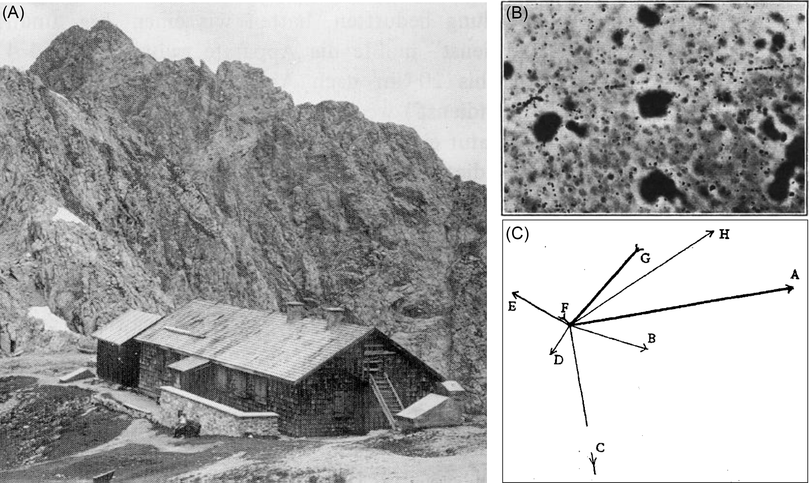 Figure 3 The discovery of the disintegration stars. (A) Cosmic-ray observatory at the Hafelekar (2265 m asl) near Innsbruck, now an EPS historical site. (B) Photographic plate showing 8 tracks of heavy particles and (C) corresponding sketch of these tracks, reproduced from Blau and Wambacher (Reference Blau and Wambacher1937a).