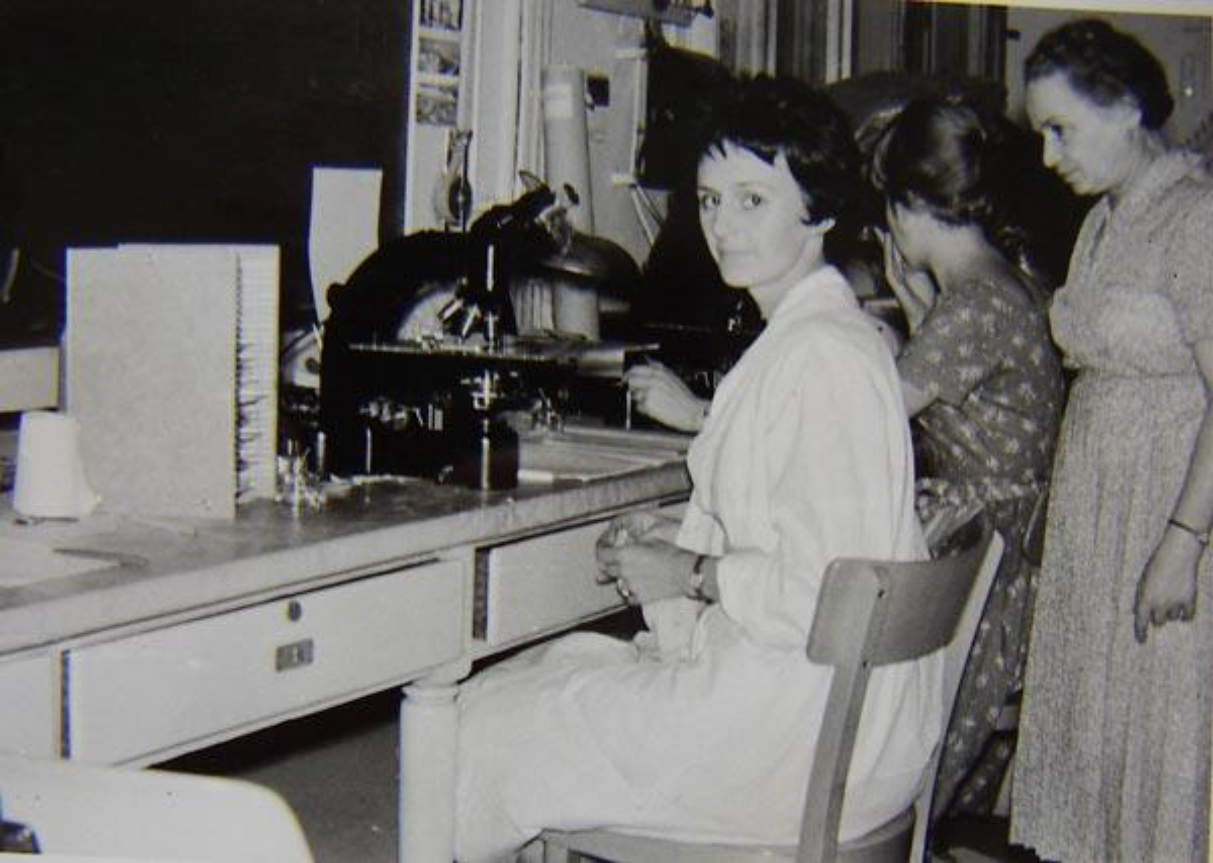 Figure 4 Marietta Blau (right) watching students scanning photographic plates at the Vienna Radium Institute in the 1960s. On the left is Lore Eggstain. (Archive R. & L. Sexl).