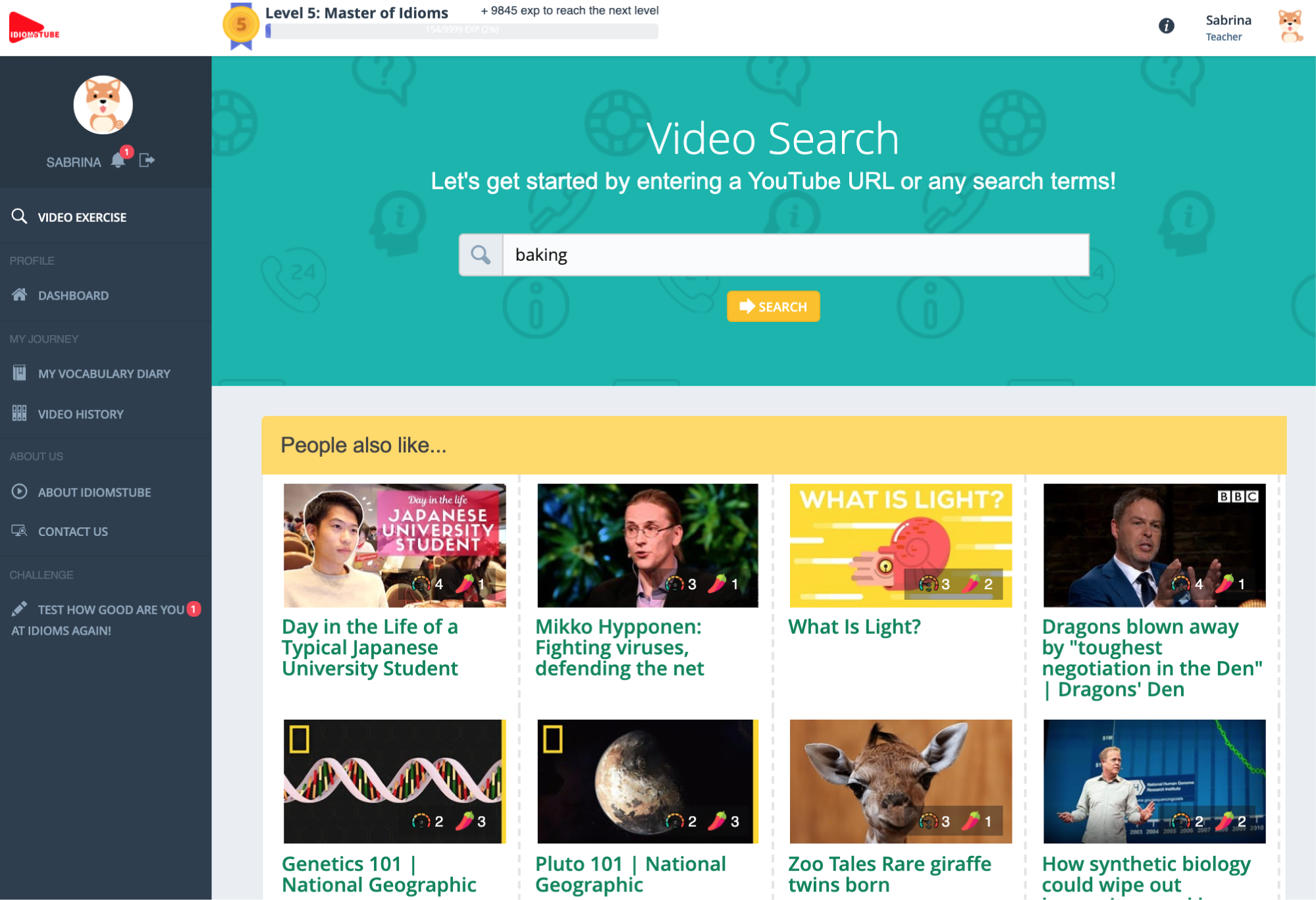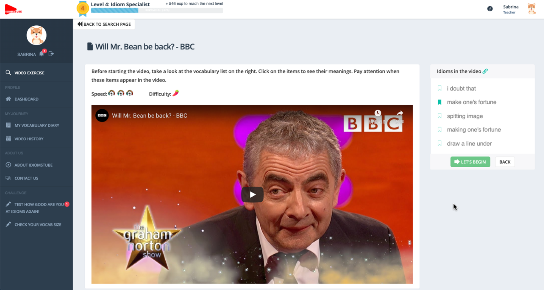 To offer a comprehensive and enjoyable FE learning experience, IdiomsTube also provides a range of special enhancement features such as gamification, idiom-of-the-day posts, the IdiomsTube Teacher’s interface and IdiomsTube Facebook and Instagram pages.