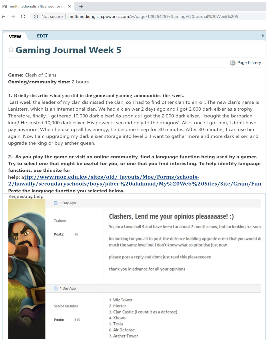 A gaming journal (see Appendix A) was then introduced to carry out the game-enhanced activities for 11 weeks. The gaming journal was hosted on the course wiki and individual journals were made for each student. The journal reflected the three-phase BA framework: (1) observing and collecting texts, (2) guided exploration and analysis, and (3) creation and participation.