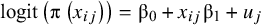 $\mathrm{logit}\left(\unicode{x3c0} \left({x}_{ij}\right)\right)={\unicode{x3b2}}_0+{x}_{ij}{\unicode{x3b2}}_1+{u}_j$