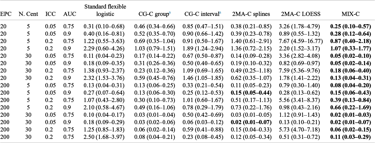 Table 3 Median (IQR) squared difference between true average probabilities and estimated observed proportion (MSCE) with logistic calibration, CG-C (10 groups), 2MA-C, and MIX-C methods for a logistic model varying training sample events per center and number of centers. Bold numbers indicate best performance across approaches