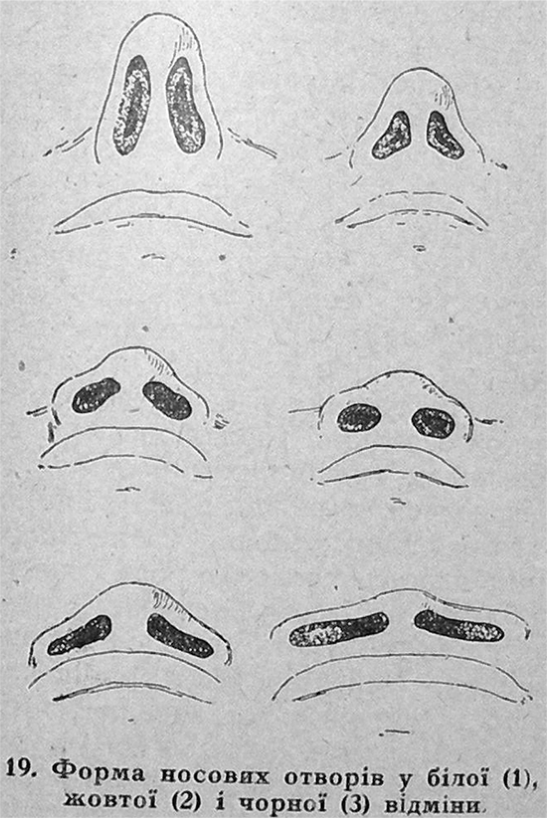 Figure 2. “Nasal forms of whites (1), yellows (2), and black (3).” Iendyk, Vstup do rasovoi budovy Ukrainy, 59.