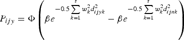 $P_{ijy} = \Phi \left(\beta e^{ - 0.5\sum\limits_{k = 1}^s {w_k^2 d_{ijyk}^2}} - \beta e^{ - 0.5\sum\limits_{k = 1}^s {w_k^2 d_{ijnk}^2}}\right) $